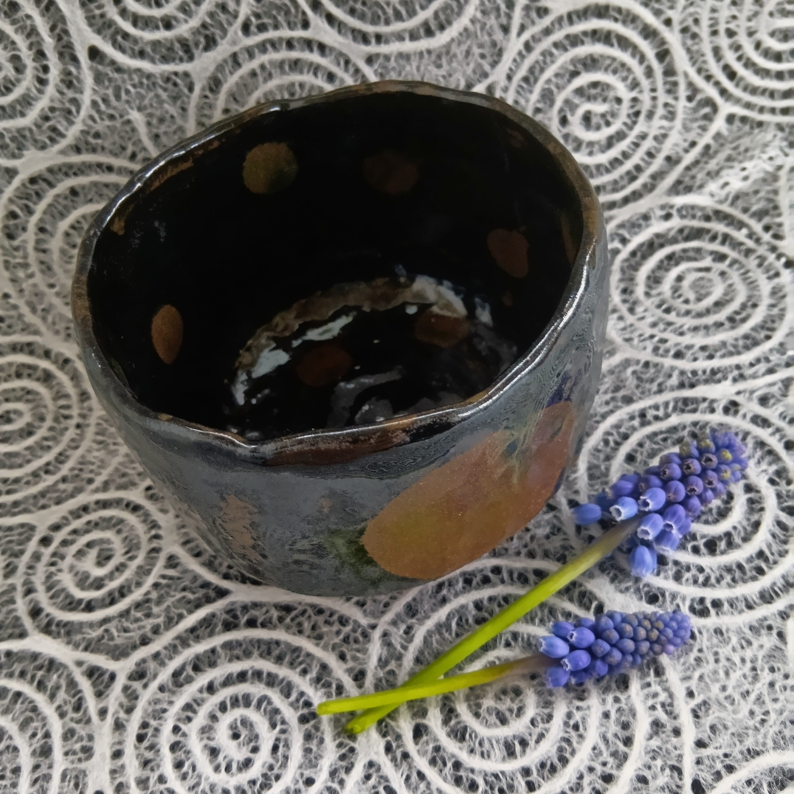 濃い茶の下地に黒のペイントで、模様をあしらいました。見えるか見えないかのかすかな水玉模様。渋くてかわいい、大人の小鉢です。