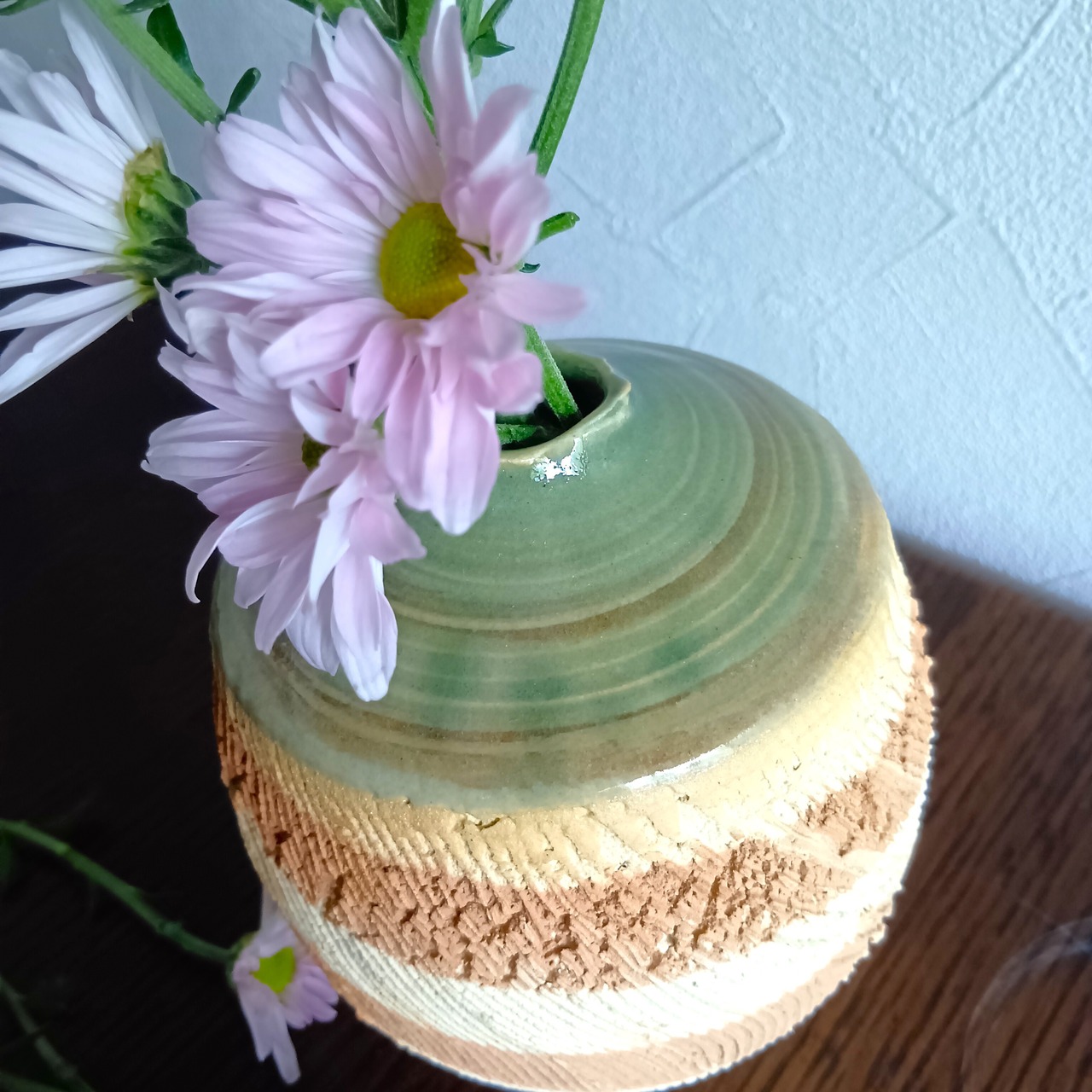 木星を思わせる赤茶と白の縞模様の花入れに、緑の釉薬で生命感をプラスしました。