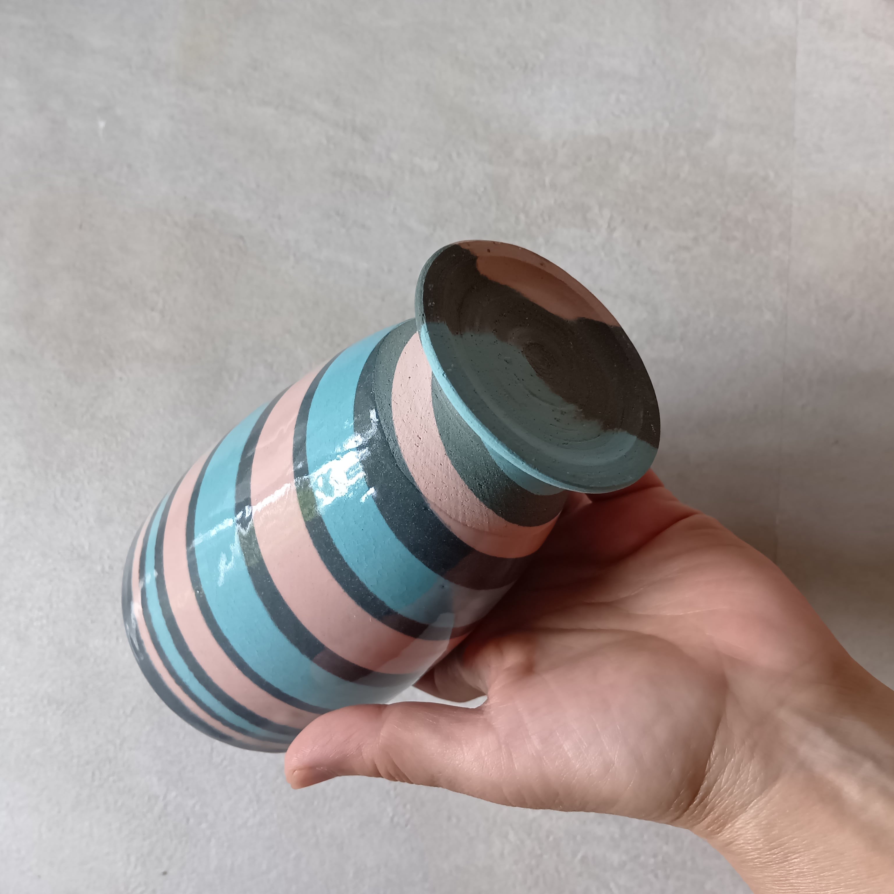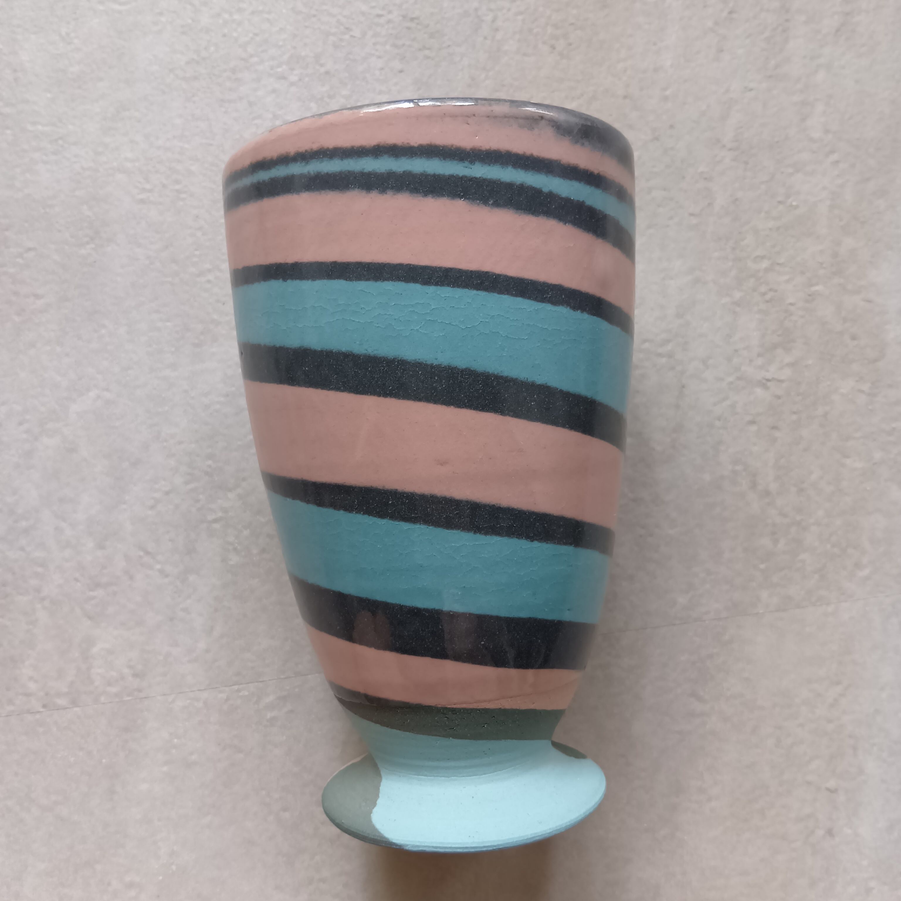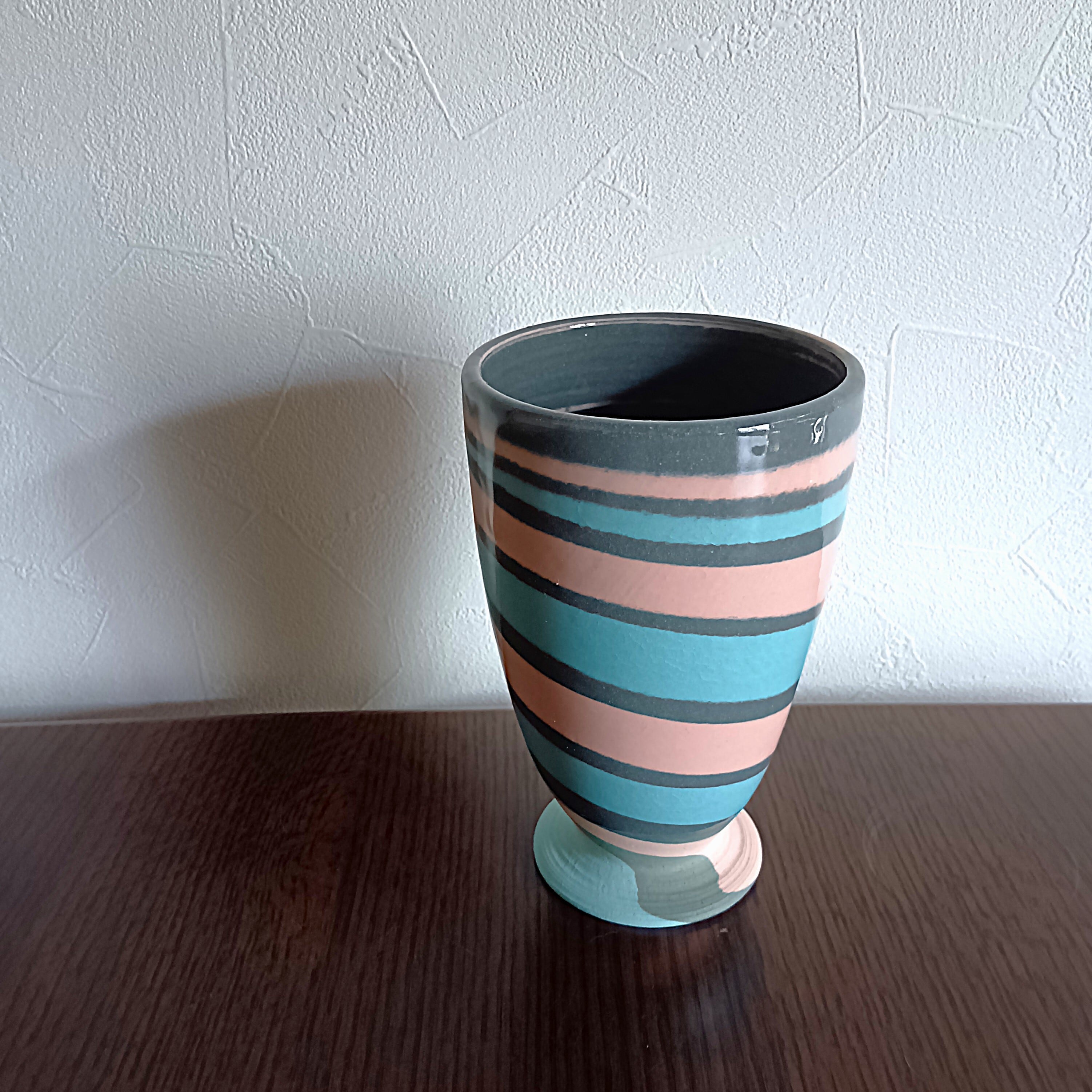 ピンク、ブルー、グレーのストライプがブライトなビアカップです。